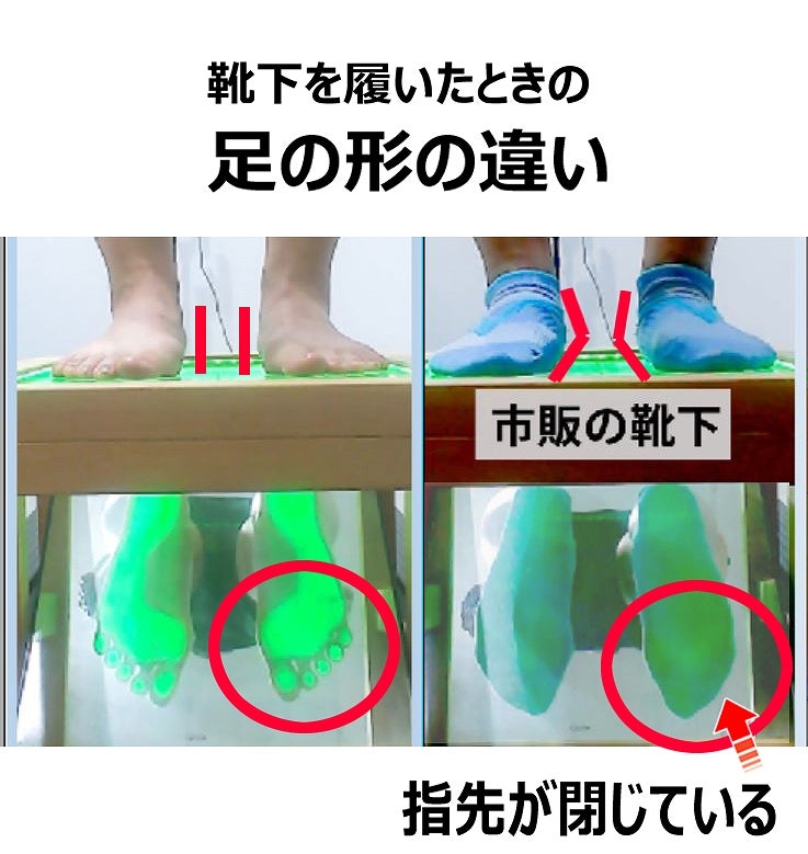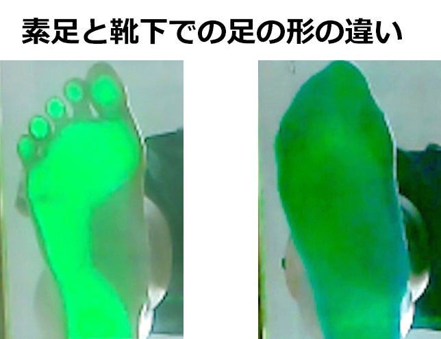 素足と、靴下着用時の足の形の違いです。
